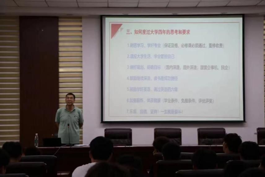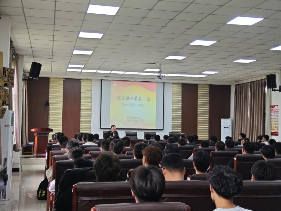 9月8日下午学院院长张光存为同学们进行了一场深刻而精彩的讲座。同时也向各位大一新生介绍了我院的人才培养模式与我院特色专业与特色优势。他勉励同学们要树立远大理想,厚植爱国情怀,练就过硬本领,不断彰显青春风采,贡献青春力量。