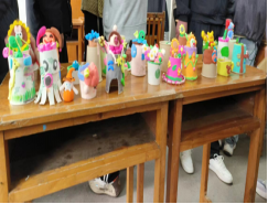 活动现场,同学们选择不同的材料与自己的小伙伴三三两两各自围成一个小圈,全神贯注的制作着他们的作品。